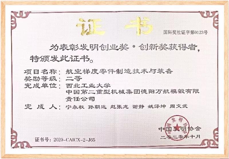 (通訊員 周文武  王婭莉)近日,萬航模鍛聯(lián)合西北工業(yè)大學(xué)聯(lián)合申報(bào)的《航空梯度零件制造技術(shù)與裝備》項(xiàng)目榮獲中國發(fā)明協(xié)會(huì)發(fā)明創(chuàng)業(yè)獎(jiǎng)·創(chuàng)新獎(jiǎng)二等獎(jiǎng)。
