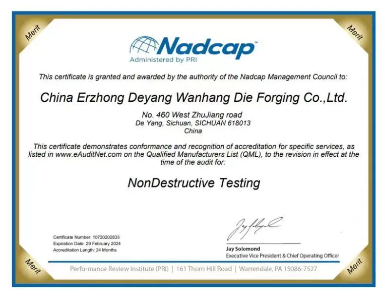 近日,萬(wàn)航模鍛以書(shū)面“零”不符合項(xiàng)的優(yōu)異成績(jī),順利通過(guò)NDT(無(wú)損檢測(cè))專(zhuān)業(yè)Nadcap認(rèn)證審核,再次獲得金牌證書(shū)。這是萬(wàn)航模鍛繼2019年現(xiàn)場(chǎng)審核“零”不符合項(xiàng)后,獲得的又一次褒獎(jiǎng),意味著再次獲得延期24個(gè)月的審核周期獎(jiǎng)勵(lì)。