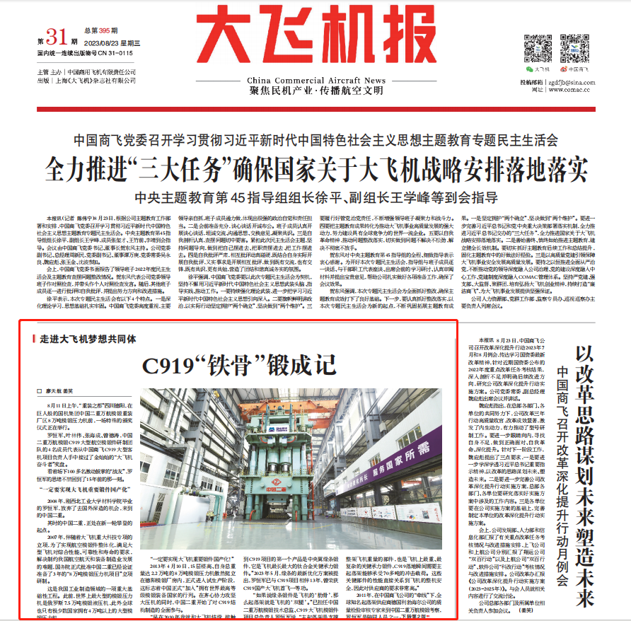 近日,由中國(guó)商飛主辦的《大飛機(jī)報(bào)》頭版“走進(jìn)大飛機(jī)夢(mèng)想共同體”專欄刊登通訊《C919鐵骨鍛成記》。