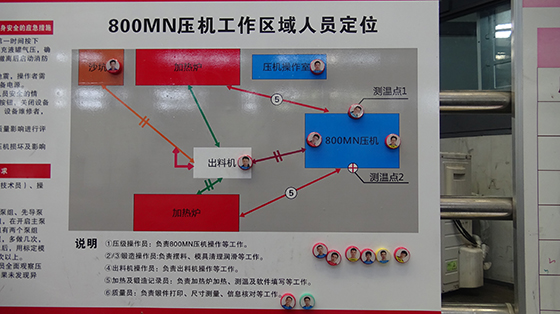 萬航公司模鍛廠800MN生產班組在該13件產品的制造過程中,以《鍛造工藝卡》為操作綱領,嚴格貫徹落實各項工藝要求。在鍛造前,班組成員對制造過程進行了全面梳理,分解落實了各工序的操作要求,并對人員工作區(qū)域進行了定位。制造過程中,班組各工序人員嚴格按照分工職責在定位區(qū)域內按生產前議定的操作要領規(guī)范操作,整個鍛造過程有條不紊、井然有序,且每一件產品的生產過程均保持一致。