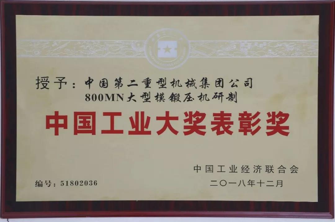 中國第二重型機械集團有限公司(以下簡稱“中國二重”)的800MN大型模鍛壓機(8萬噸模鍛壓力機)研制項目獲得“中國工業(yè)大獎表彰獎”。