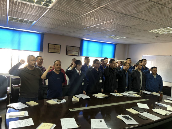 “我志愿加入中國(guó)共產(chǎn)黨,擁護(hù)黨的綱領(lǐng),遵守黨的章程,履行黨員義務(wù),執(zhí)行黨的決定,嚴(yán)守黨的紀(jì)律,保守黨的秘密,對(duì)黨忠誠(chéng),積極工作,為共產(chǎn)主義奮斗終身,隨時(shí)準(zhǔn)備為黨和人民犧牲一切,永不叛黨。宣誓人XXX?!苯?,萬(wàn)航公司模鍛廠黨員面對(duì)黨旗、全體肅立、莊嚴(yán)的舉起右手,擲地有聲地重溫入黨誓詞。