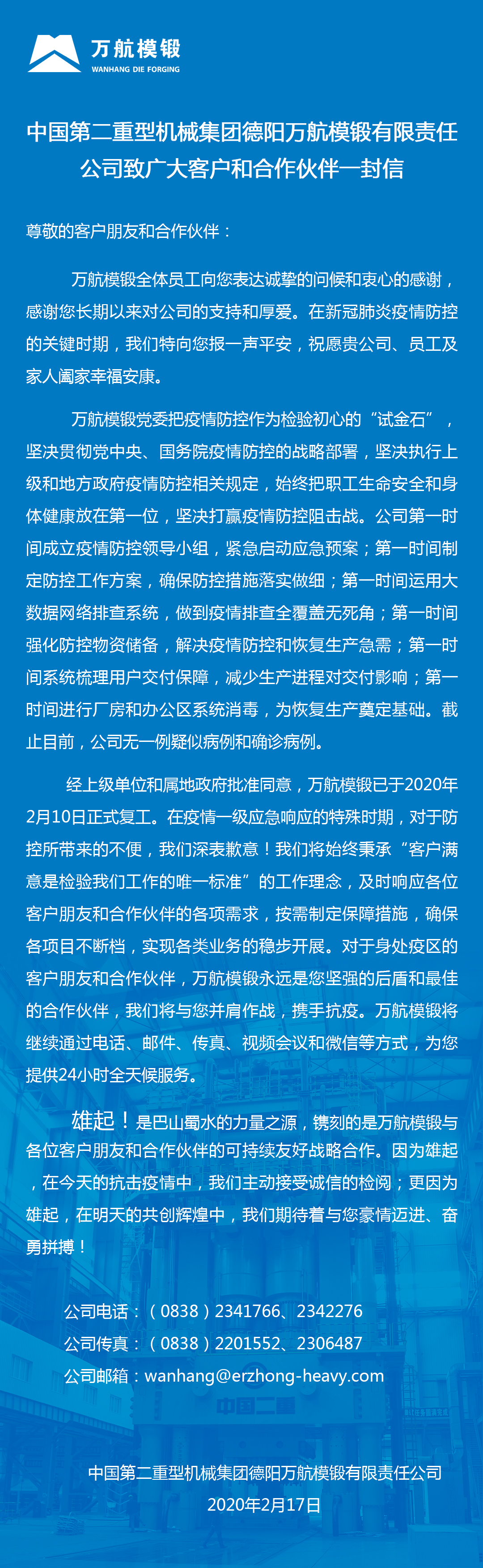 中國第二重型機(jī)械集團(tuán)德陽萬航模鍛有限責(zé)任公司致廣大客戶和合作伙伴一封信